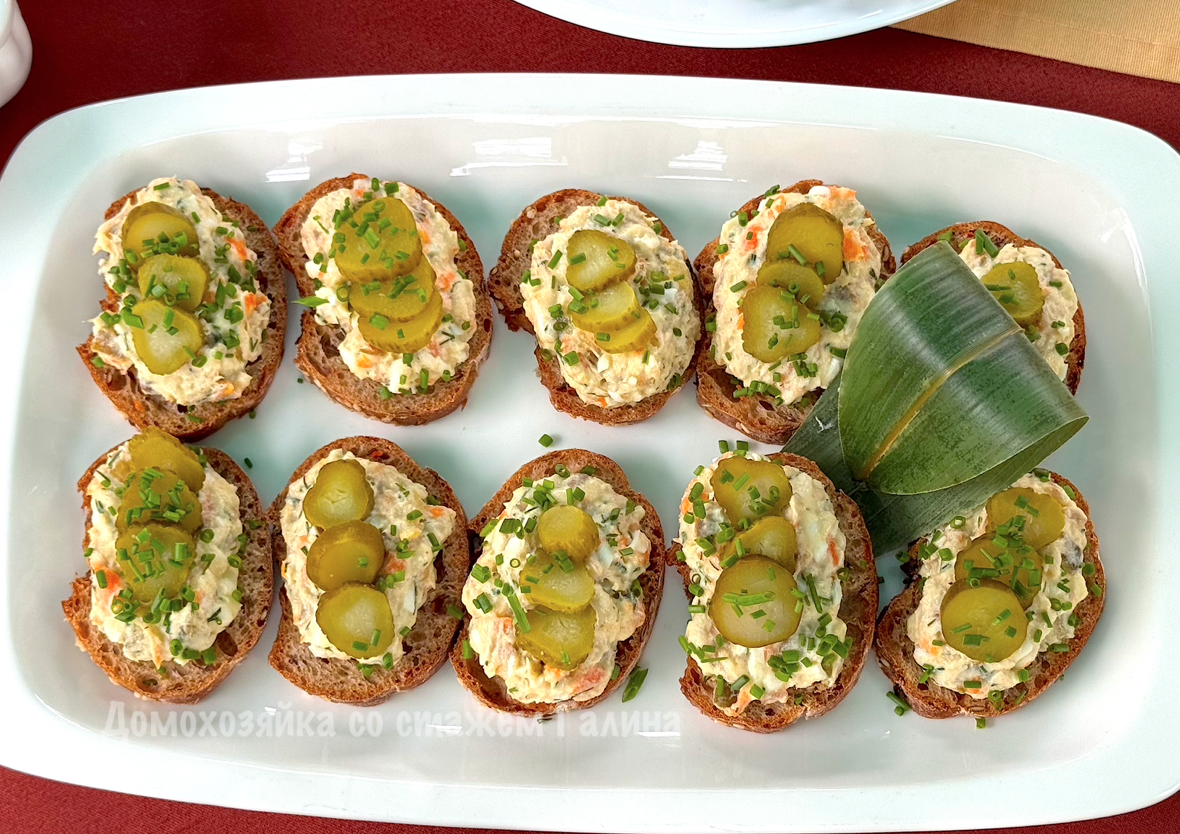 После этого багет нарезается на ломтики и поджаривается в тостере, что делает его хрустящим. Затем на каждый ломтик выкладывается аппетитная рыбная масса, а верхушку украшают маринованными огурчиками для изысканности.