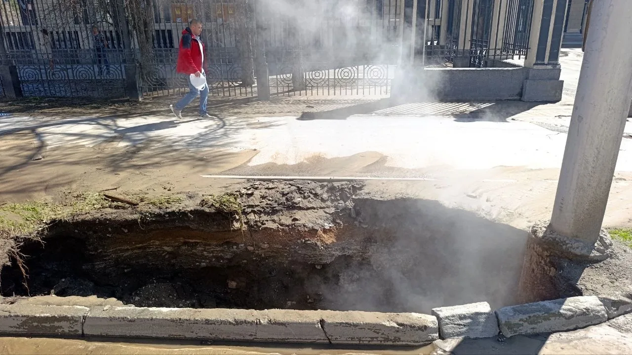 На месте образовался провал. Без горячей воды остались 14 домов. На месте работает аварийная бригада.