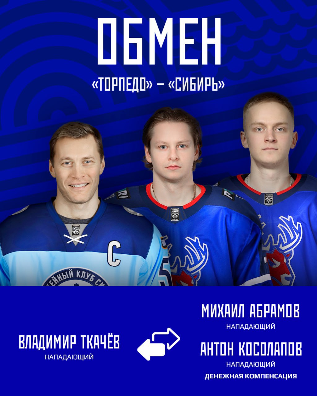 Взамен «Сибирь» получила денежную компенсацию, а также нападающих Михаила Абрамова и Антона Косолапов.